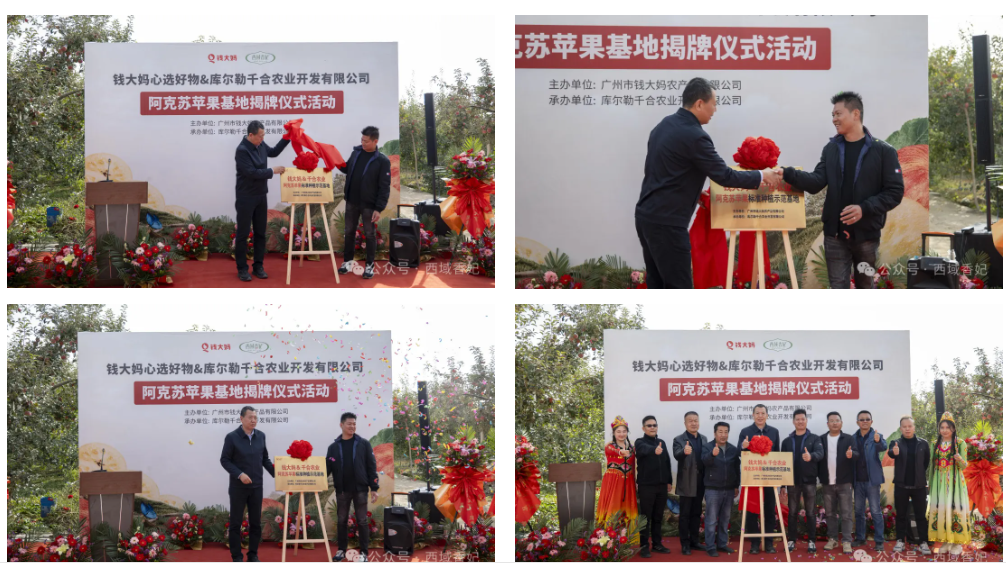 2024年10月30日阿克苏市温宿县温宿镇柯柯牙社区4组,彩旗飘飘,热闹非凡,广州钱大妈集团和库尔勒千合农业双方共同举行了阿克苏苹果基地揭牌仪式,标志着双方合作已经迈向了一个新的里程碑。双方负责人在活动中致辞并合影。