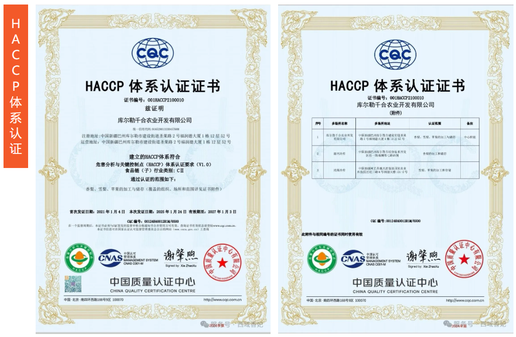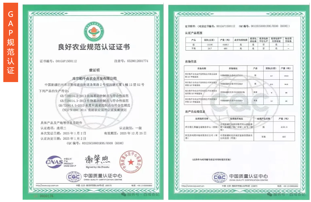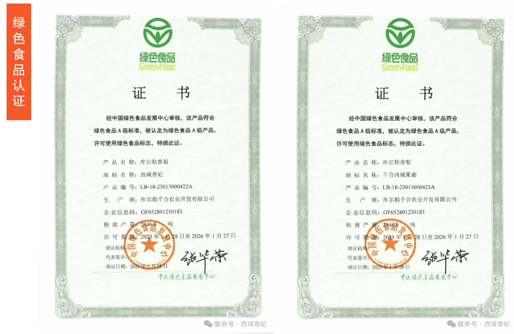 即便产量受限,我们对品质的追求从未打折。西域香妃基地的香梨,始终严格遵循GAP良好农业规范进行种植与果园管理,从土壤养护到果实采收,每一个环节都力求精细。同时,基地香梨还通过了HACCP体系认证与绿色食品认证,双重保障为您的食用安全保驾护航,让您吃得安心、吃得放心。